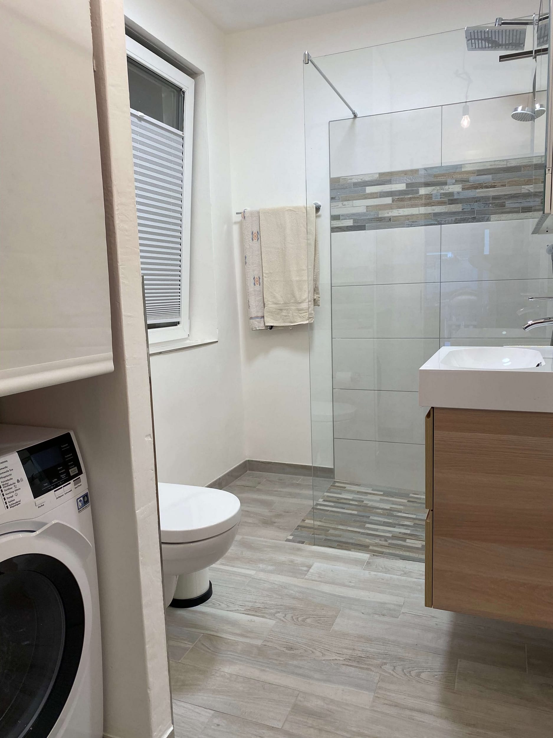 Das Bad ist modern und es gibt eine Waschmaschine mit Trockenfunktion.