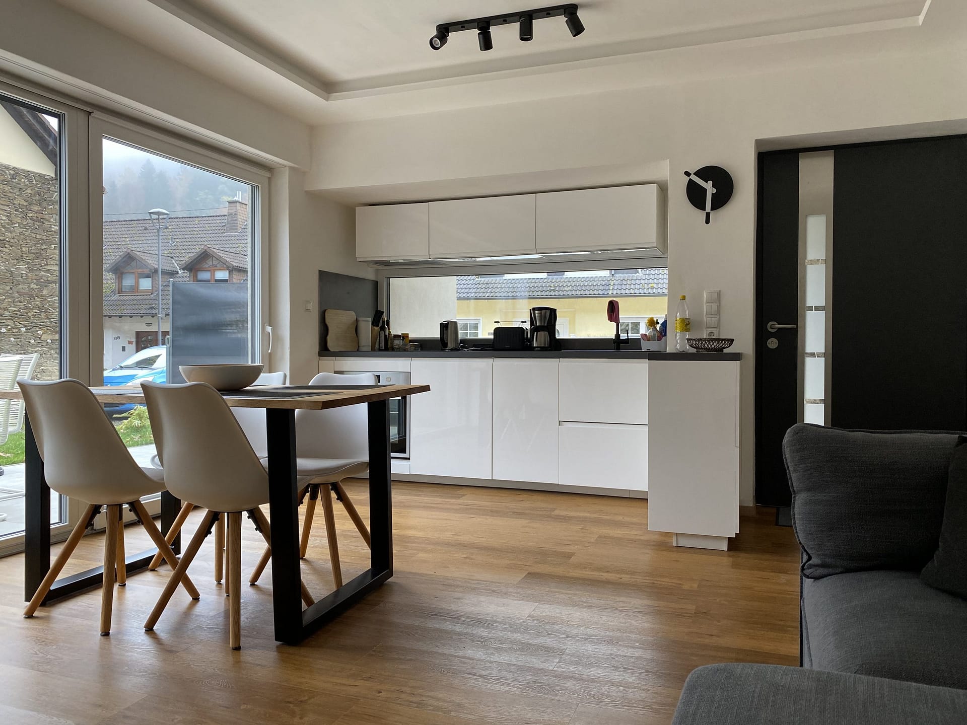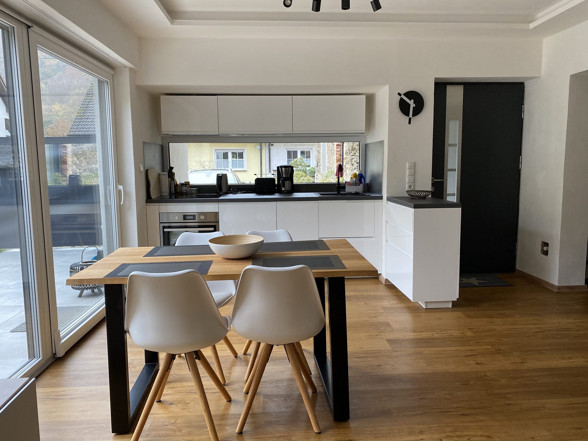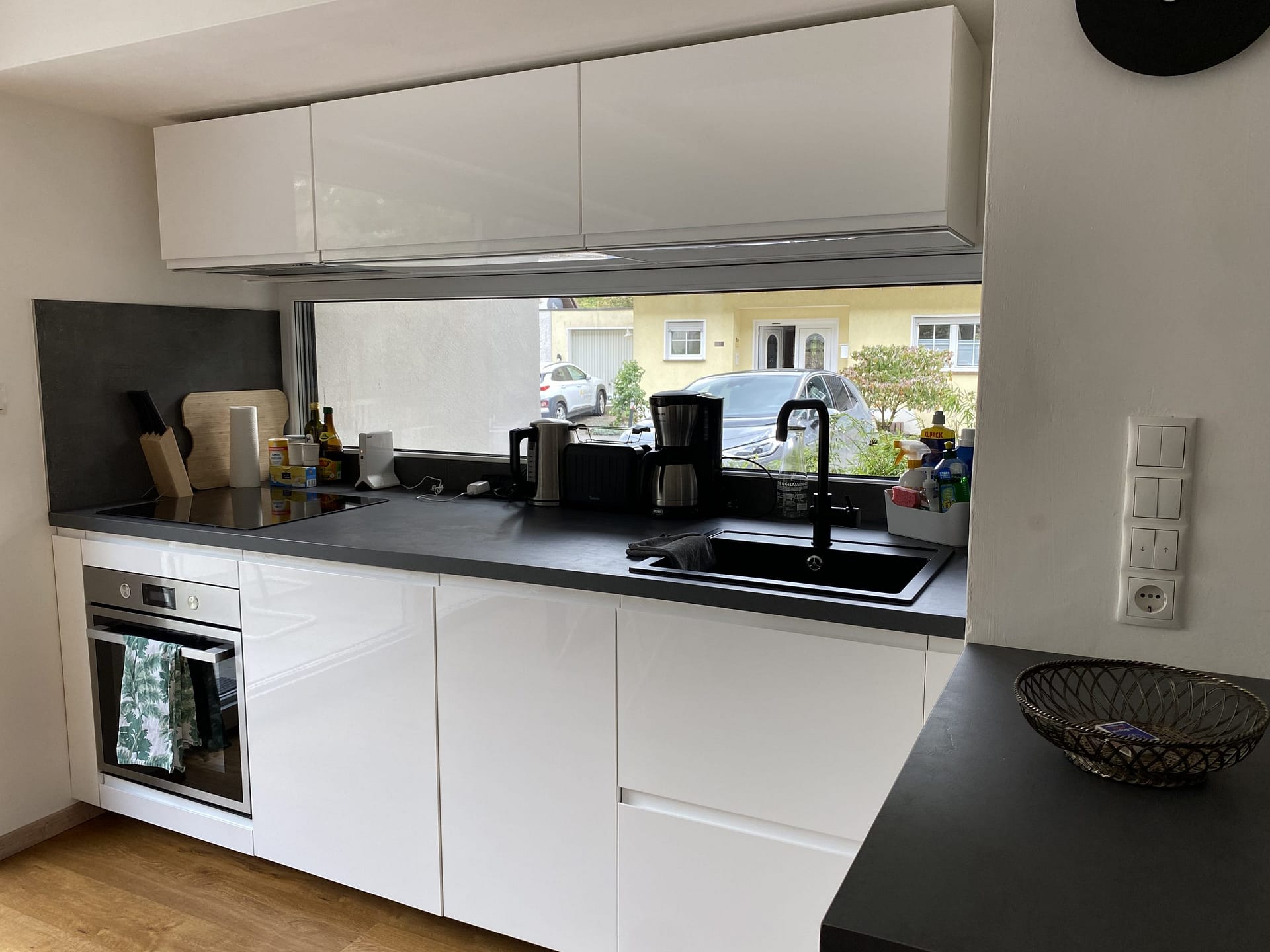 Die moderne Küche ist mit Kühlschrank, Backofen, Induktionskochfeld und Spülmaschine voll ausgestattet.