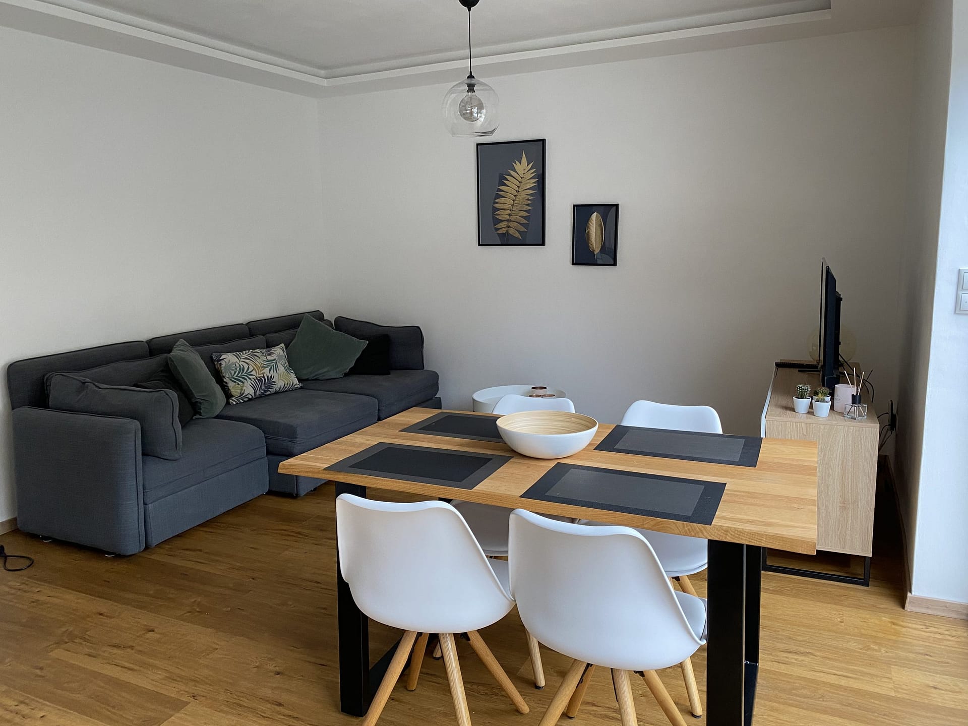 Das kleine gemütliche Apartment ist ca. 50.o m² groß und hat ein Schlafzimmer mit einem Boxspring Bett (1,80×2,00m) welches man auch zu zwei Einzelbetten umbauen kann. Zudem gibt es einen weiteren Raum mit Küche, Essplatz und gemütlichem Sitzbereich. Hier gibt es auch die Möglichkeit zwei weitere Schlafmöglichkeiten herzurichten. Entweder zwei Einzelbetten (0,80 x 2,00m) oder ein 1,60x 2,00m Bett